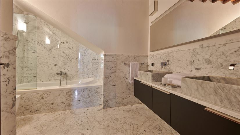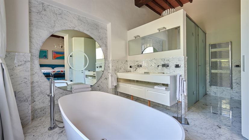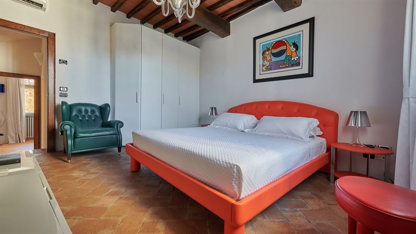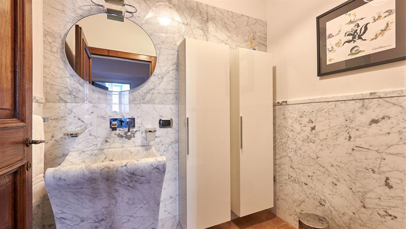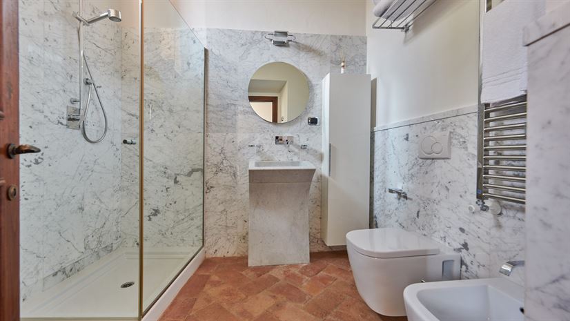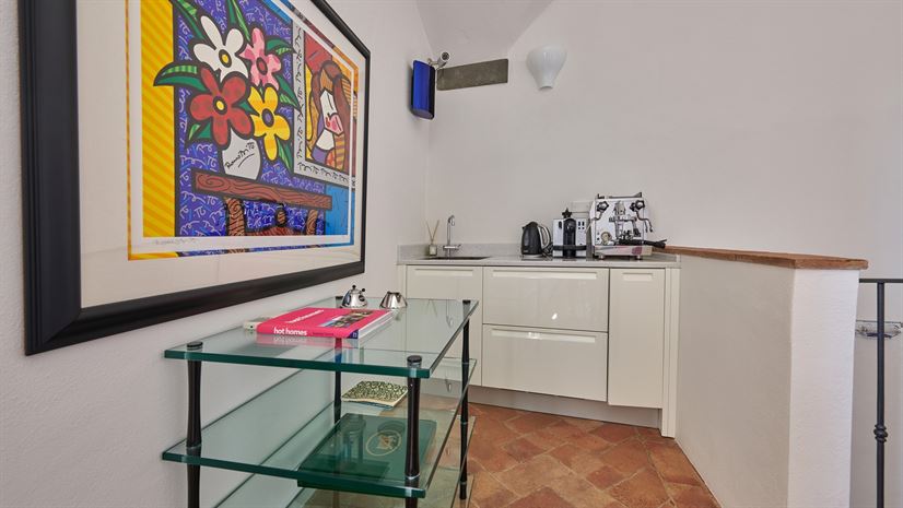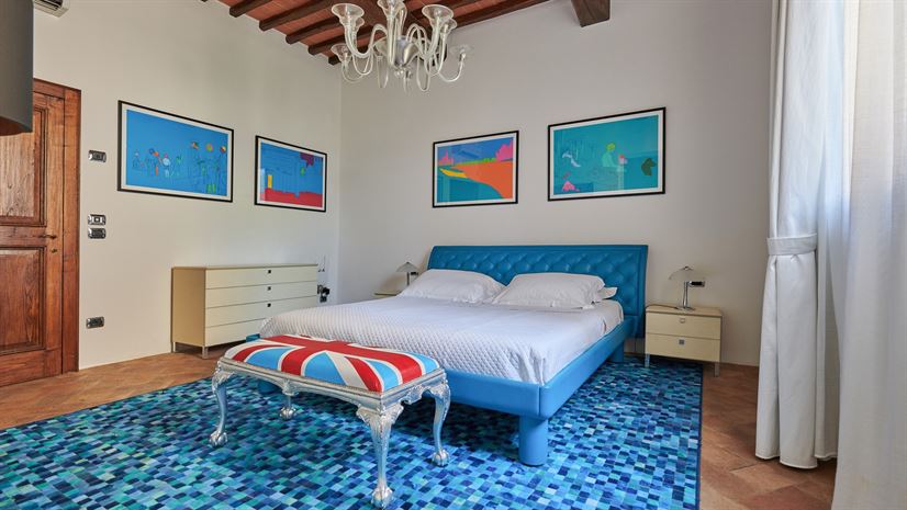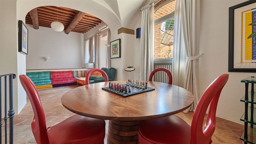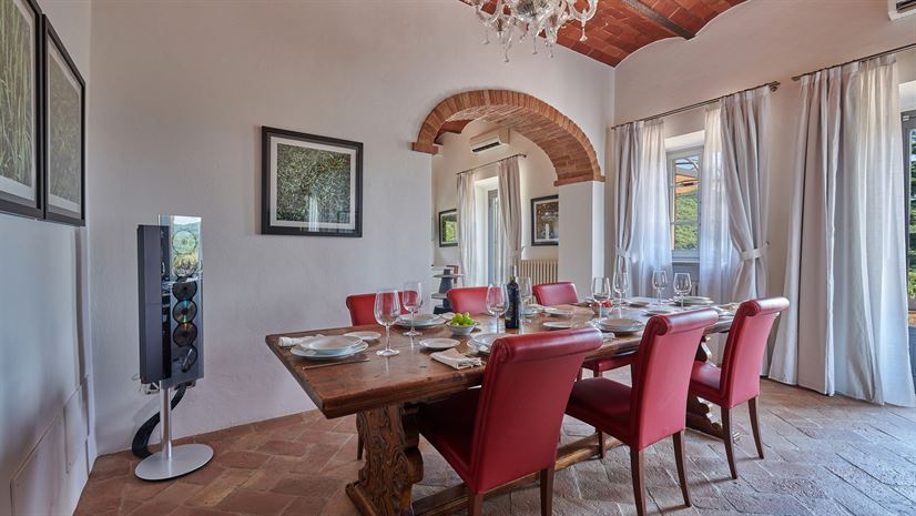 Binnen zijn originele elementen zoals gewelfde plafonds, terracottavloeren en houten balken bewaard gebleven. Deze traditionele details vormen een fraai contrast met het stijlvolle, moderne interieur dat is ontworpen door een prijswinnende interieurarchitect uit Milaan. Hoogwaardige meubels en zorgvuldig gekozen kleuraccenten zorgen voor een verfijnde en toch huiselijke sfeer.
