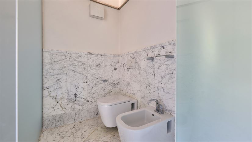 Kledingkast, badkuip, douche, dubbele wastafel, WC, bidet.