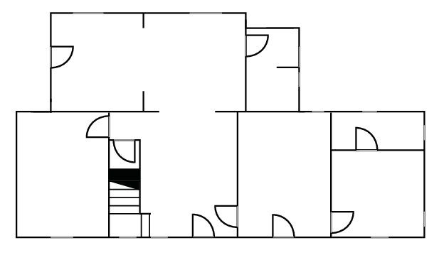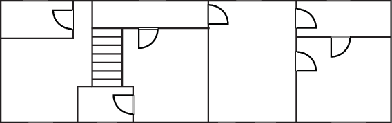 Tafel en stoelen, bureau en stoel, trap naar de eerste verdieping, hoofdentree.