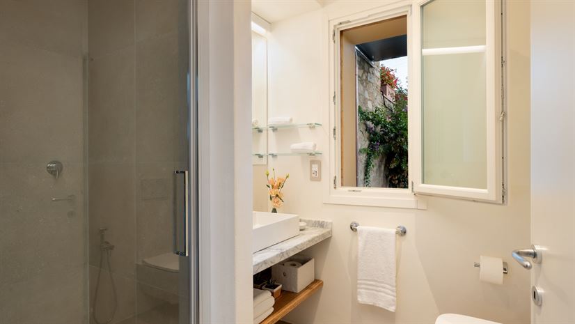 Double bed (cannot be converted to twin), bedside tables, wardrobe, chair, air-conditioning, French doors leading to the garden.