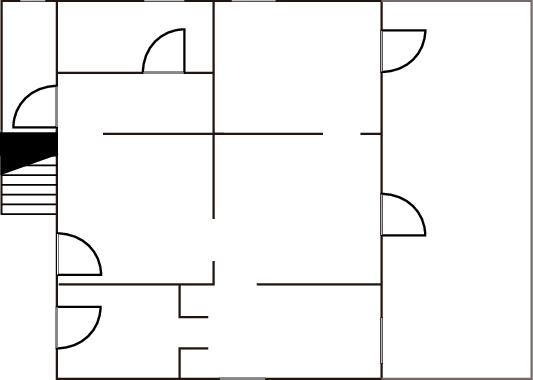 Dressoir, tafel en stoelen, bijzettafel, boekenkast, trap naar hal, openslaande deuren naar terras.