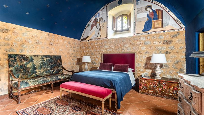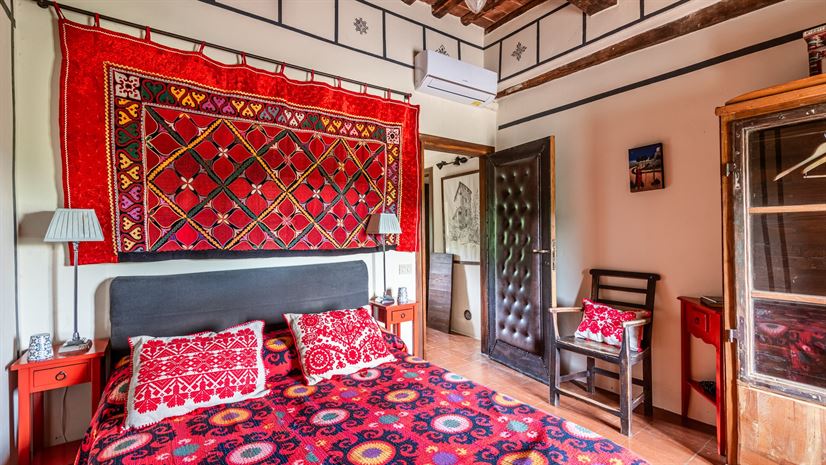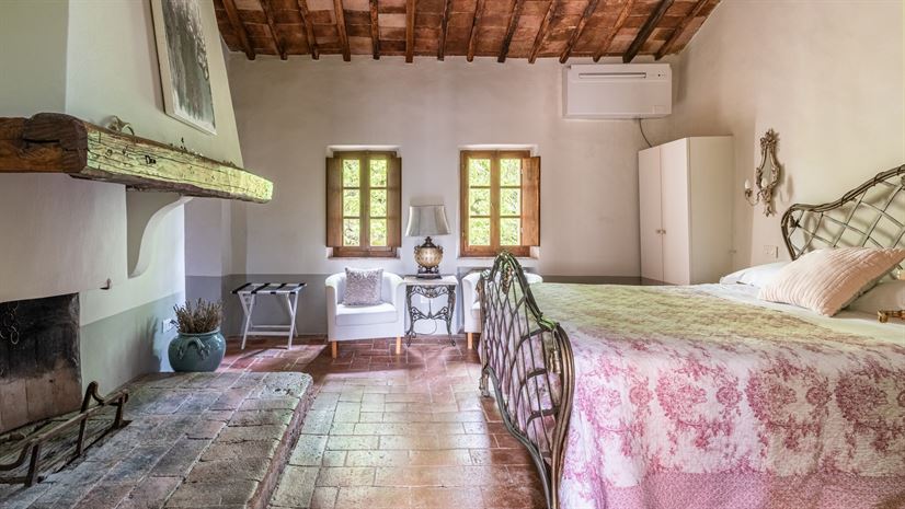 Tweepersoonsbed 150 × 195 cm (niet te veranderen in twee aparte bedden), decoratieve open haard, fauteuil, commode, kledingkast, airconditioning, kofferrek, deur naar stenen buitentrap.