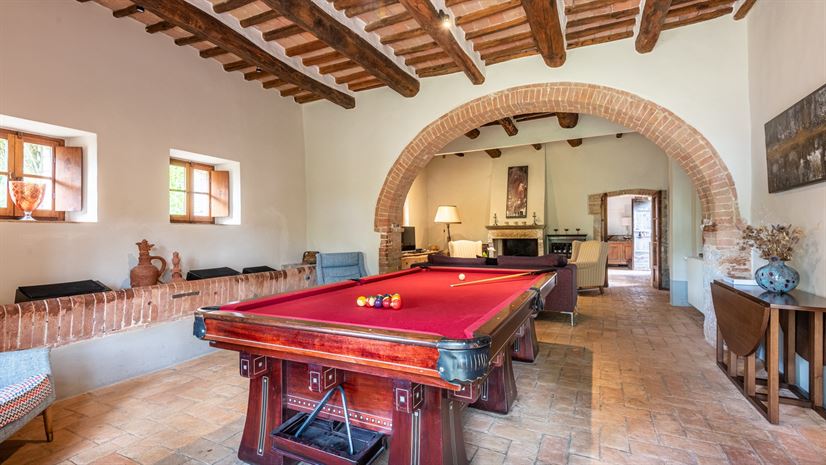 Biljarttafel, zitbank, fauteuils, salontafel, decoratieve open haard, deuren naar het terras met tuinmeubilair.